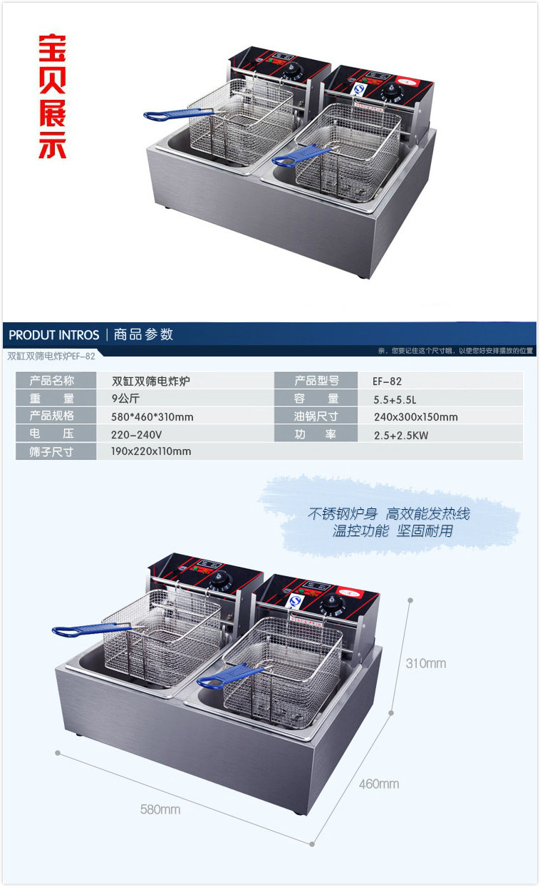 其他:種類電炸爐電壓220-240(V)功率2.5+2.5(Kw)淨重9(Kg)適用範圍:茶餐廳設備,蛋糕房設備,咖啡店設備,麵包房設備,西餐店設備,中餐店設備,飲品店設備等